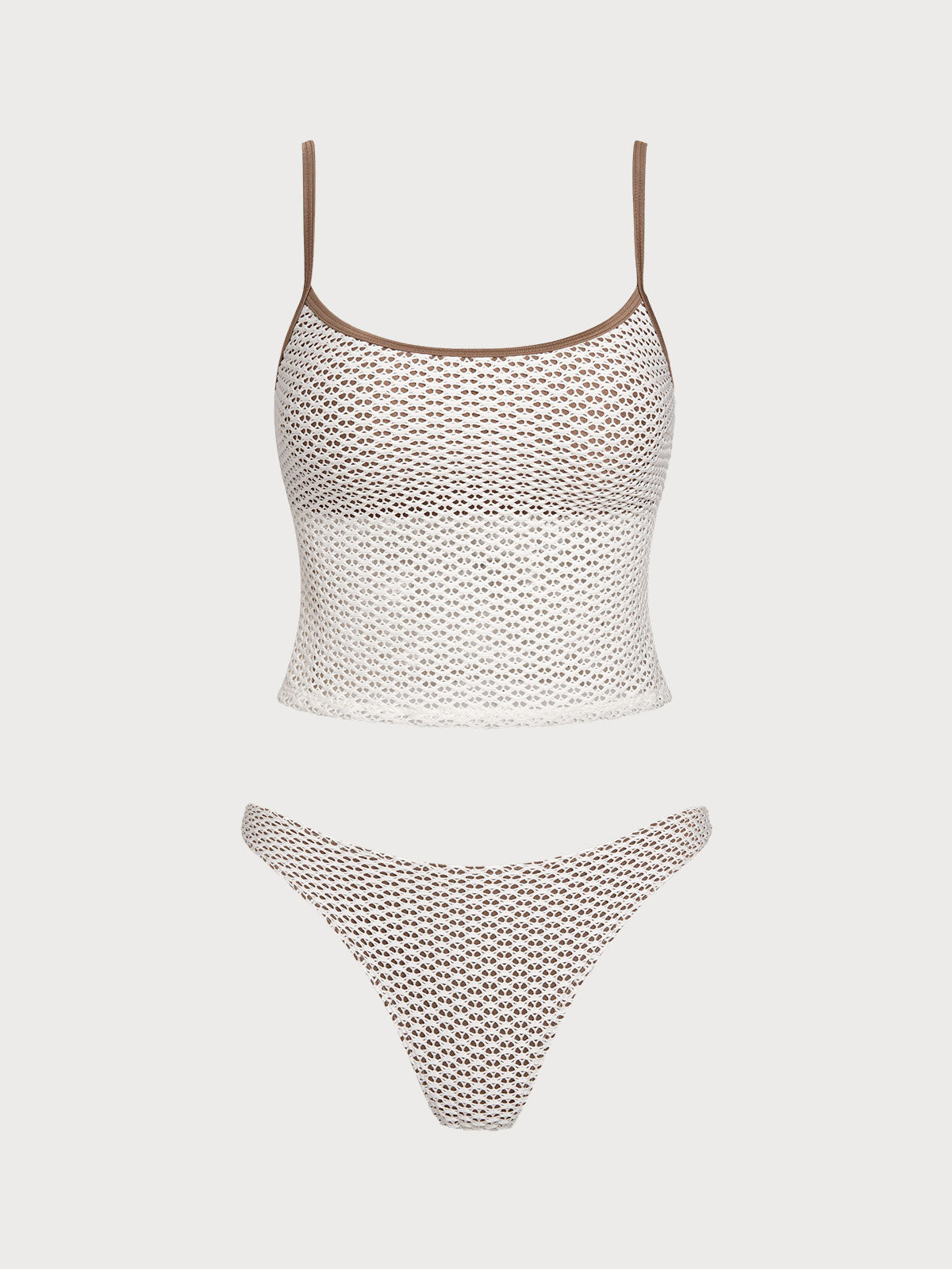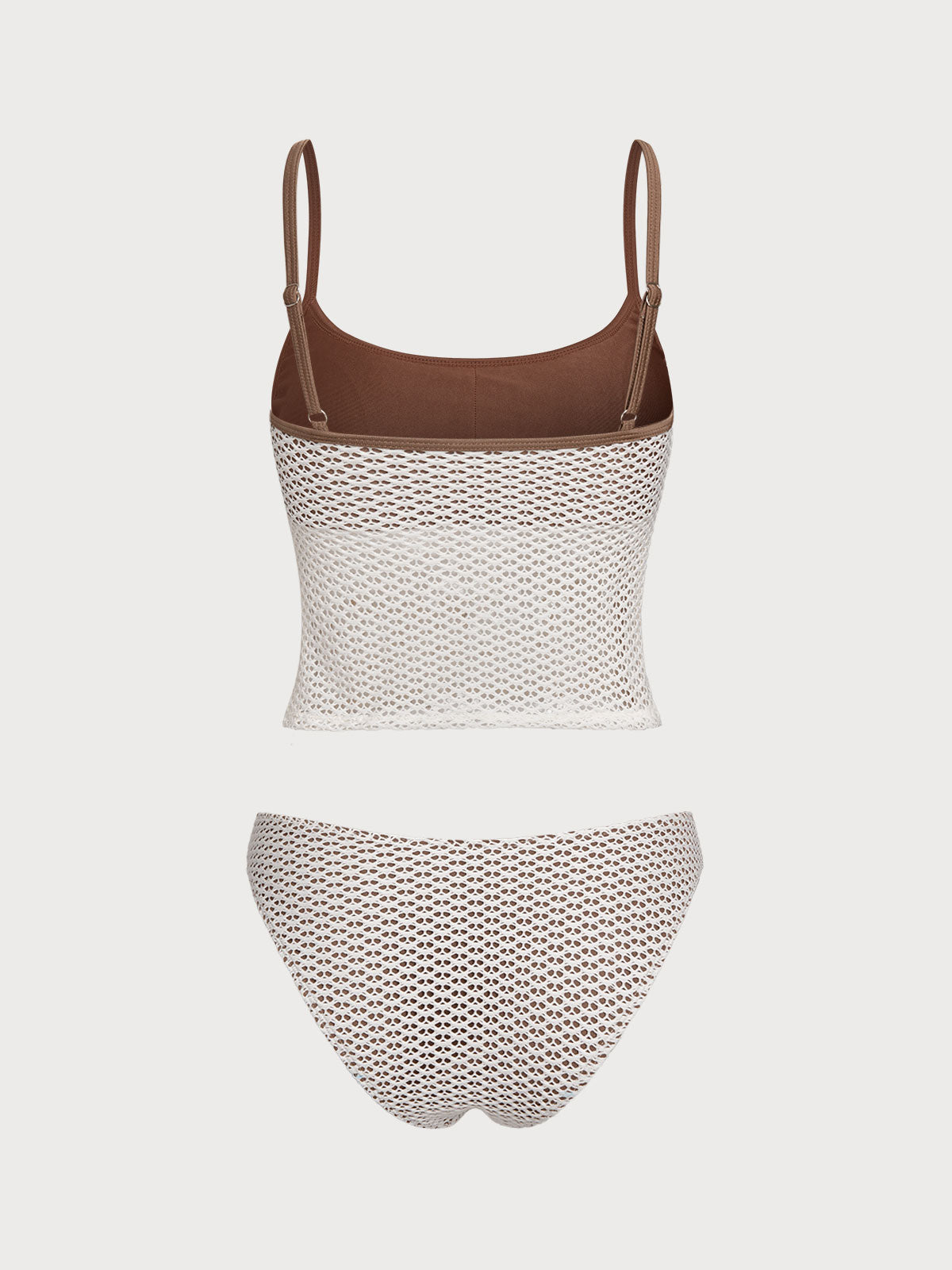 This Brown Contrast Sport Tankini Set blends dynamic support with serious comfort. Its super stretchy fabric mix lets you move freely—no restrictions, whether you’re swimming or playing. Cute crochet touches and smart tailoring craft a smooth, streamlined look, with full cups that fit comfortably and a U-neck that stays supportive. Below, the low-rise waist and mid-cut legs give just the right versatile coverage, moving easily with every step.