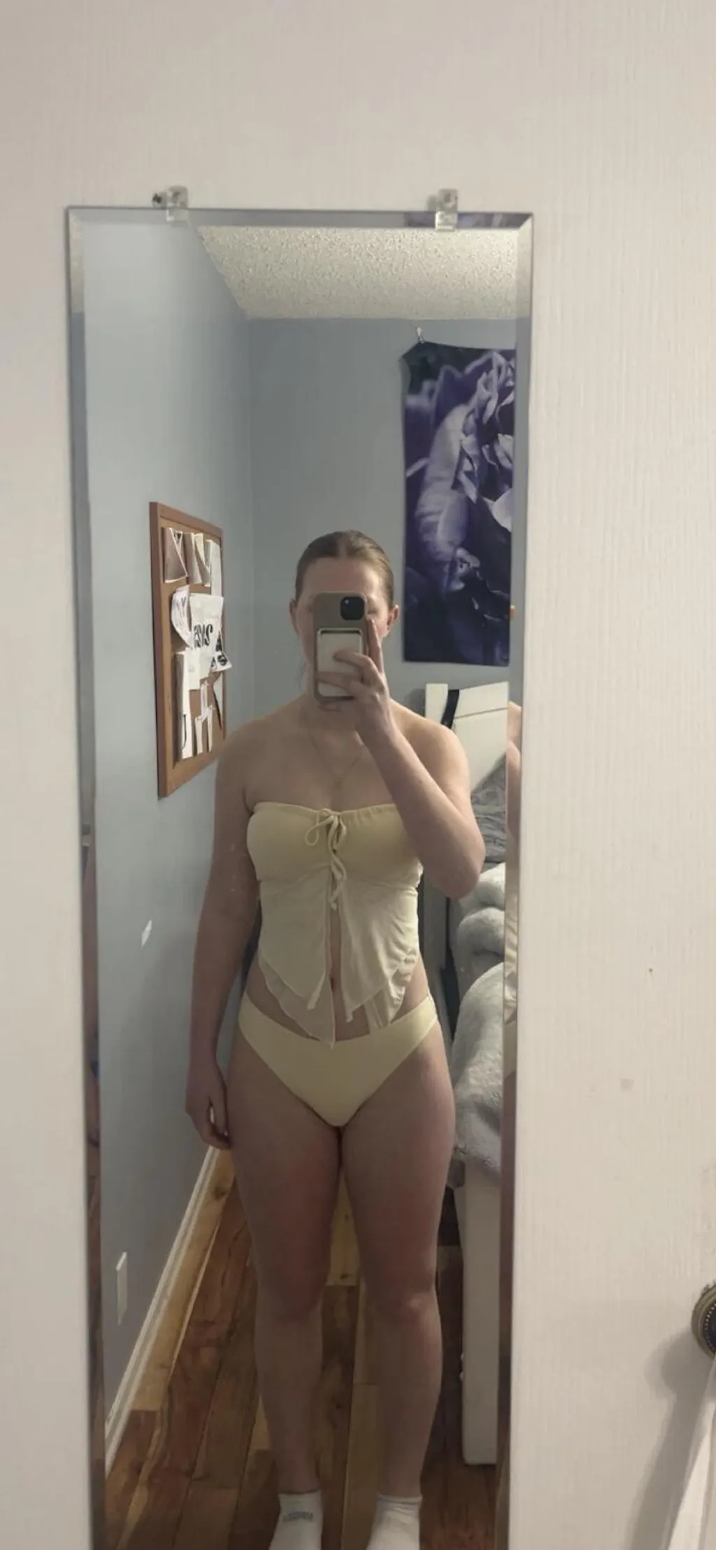 Really cute, I love the style of it, sits a little weirdly on my chest with the padding in but maybe just needs to be worn in a little? Bottoms are a little cheekier than I thought they’d be but overall still very happy. Adore the colour on my skin tone as I’m very pale and worried it wouldnt be flattering but it’s adorable!