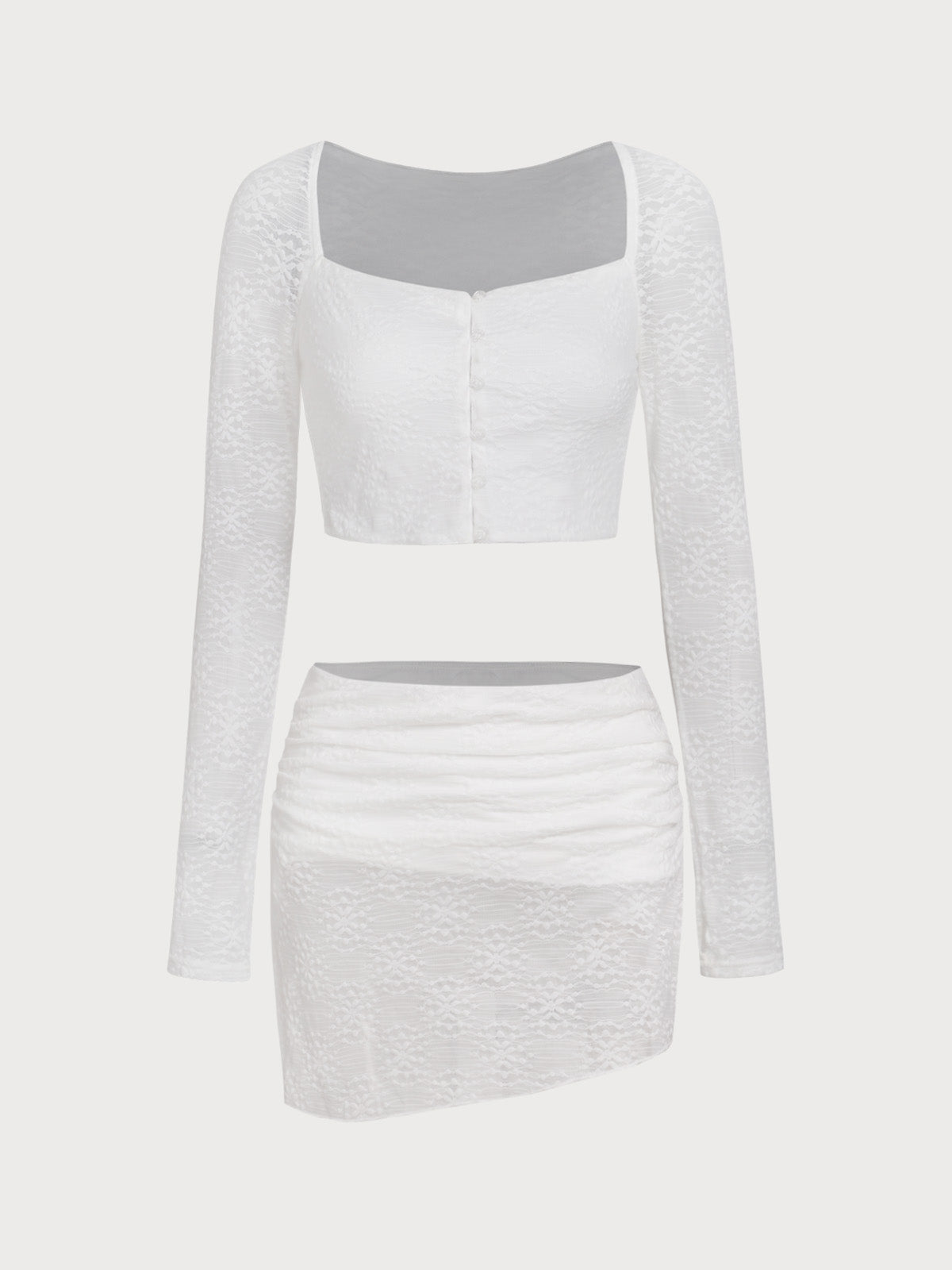 Zweiteiliges Set aus weißer Spitze mit langen Ärmeln und kurzem Rock