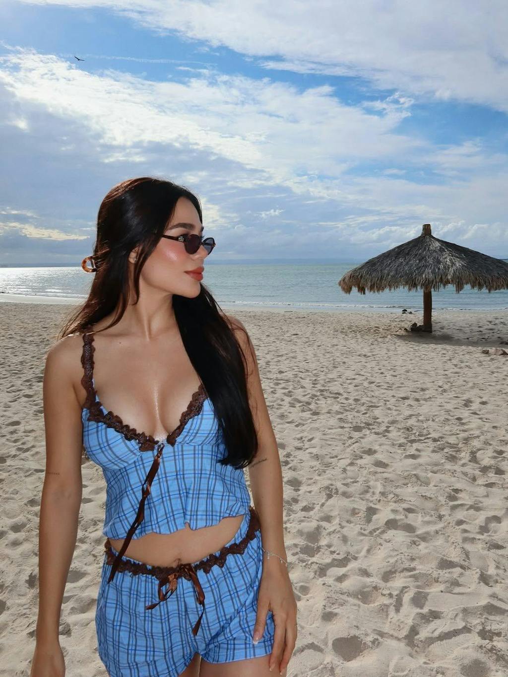 I’m obsessed with the plaid and lace combo! The little tie-front knots are so sweet and playful. Amazing quality—the material feels high-end and the floral accents are just everything. Literally wearing my vacation mood right now!