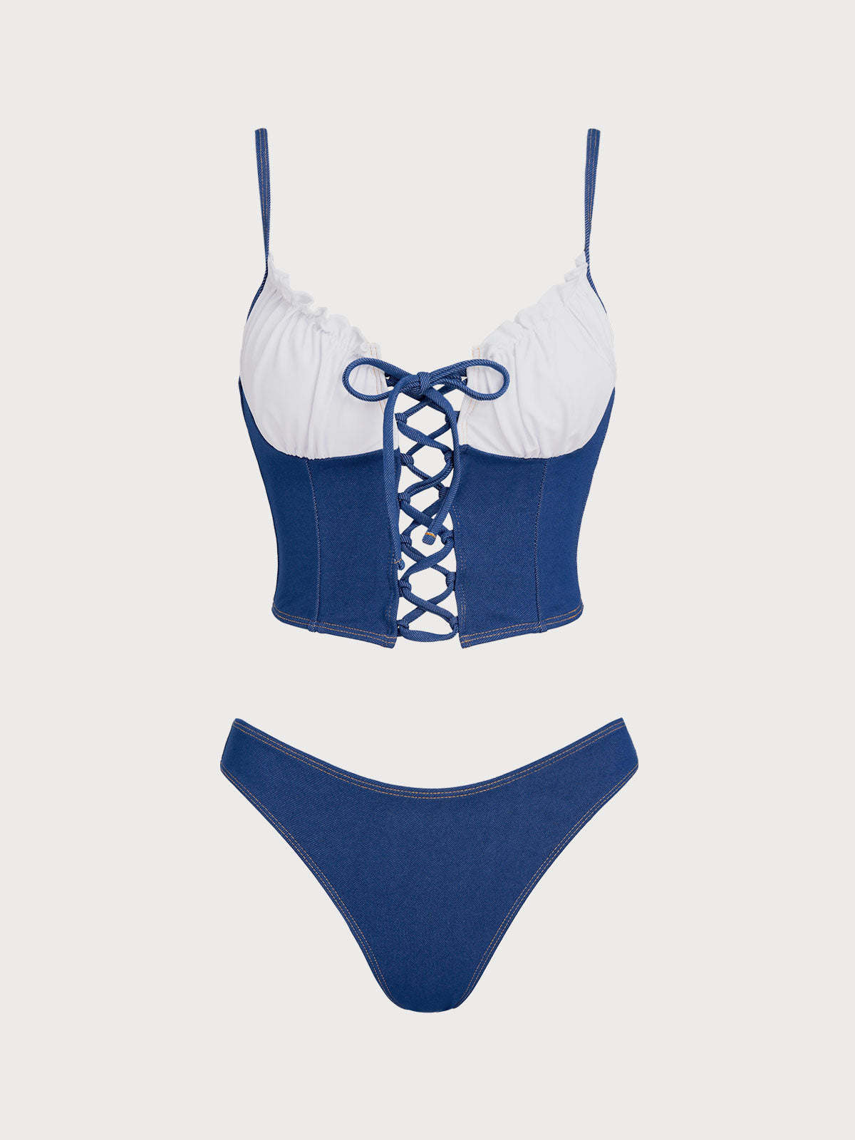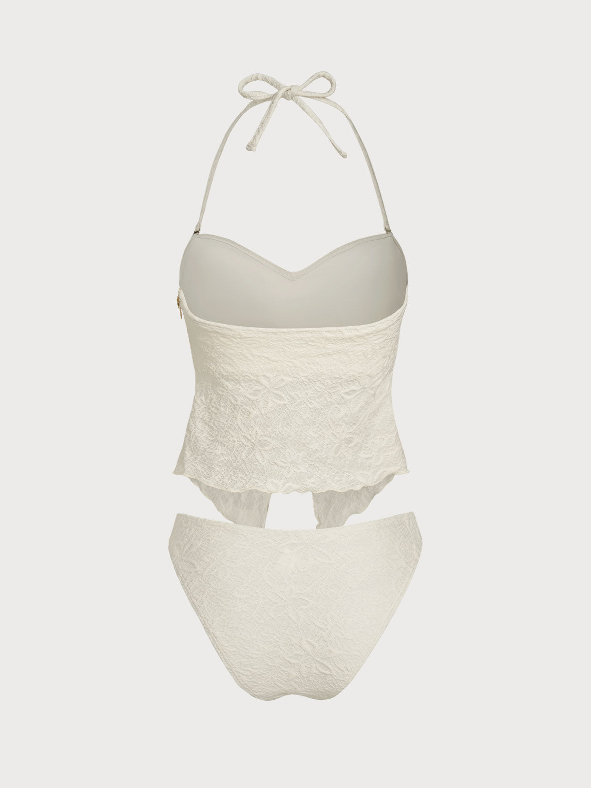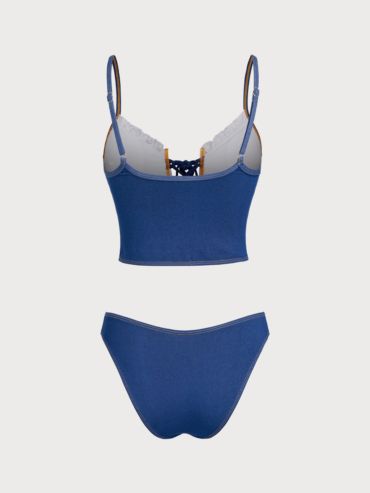 Brown Irregular Hem Contrast Beaded Tankini Set