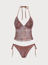 Brown Shirred Leopard Print Tankini Swimsuit: leopard print rises from the pleats. High-stretch spandex (92/8) glides across the skin like sun-warmed prairie grass. The square neckline is defined by the full cups - the removable cups nestle under the pleats. The front ties and the back are connected to the lining with animal prints. The perfect combination of prairie wisdom and urban tailoring.