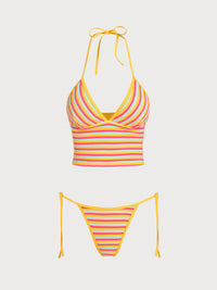Our orange striped tankini features a stylish halter neckline with adjustable drawstring closure, perfect for any fit. Made with 4-way stretch fabric and cut high on the leg, it is guaranteed to provide a full range of motion and comfort. With textured stripes and moderate coverage, it's an easy way to mix style with sensibility.