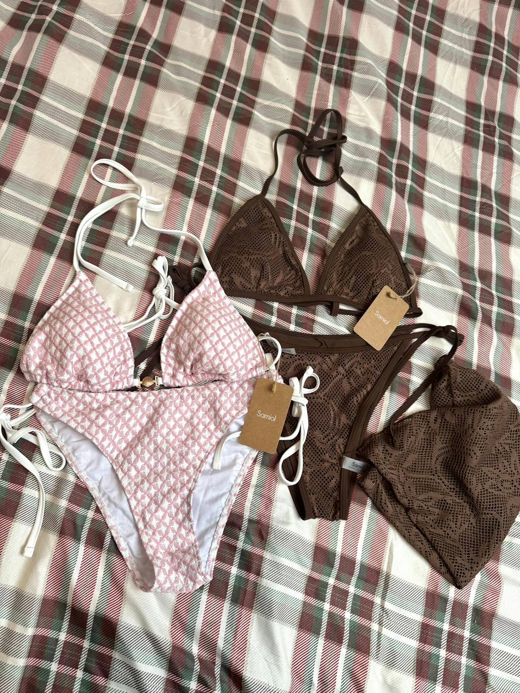 Dig this Pink Polyester Knitted Shell Trim Bikini Set—it’s got that fun, flirty vibe! Made with 96% polyester and 4% spandex, the fabric stretches like a dream. Demi cup coverage with removable soft cups keeps things cute and supported, while the halter neck stays secure. Love the little touches: contrasting colors that pop, cute knots, and ties. Textured jacquard with shell trim for that beachy feel.