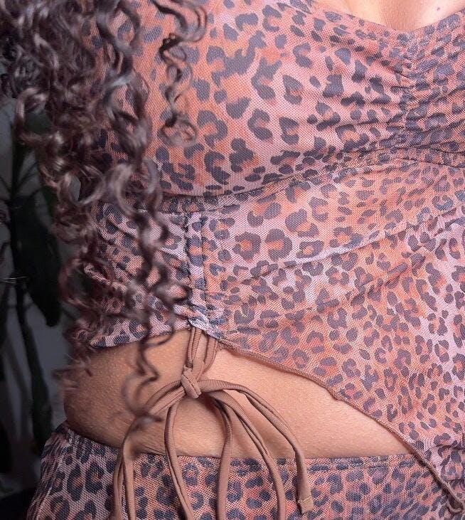 Brown Shirred Leopard Print Tankini Swimsuit: leopard print rises from the pleats. High-stretch spandex (92/8) glides across the skin like sun-warmed prairie grass. The square neckline is defined by the full cups - the removable cups nestle under the pleats. The front ties and the back are connected to the lining with animal prints. The perfect combination of prairie wisdom and urban tailoring.