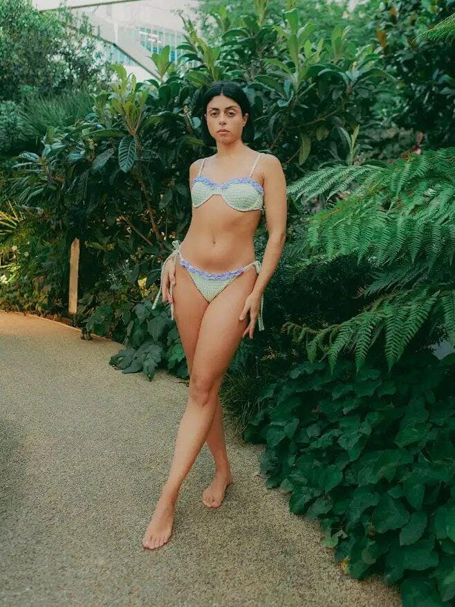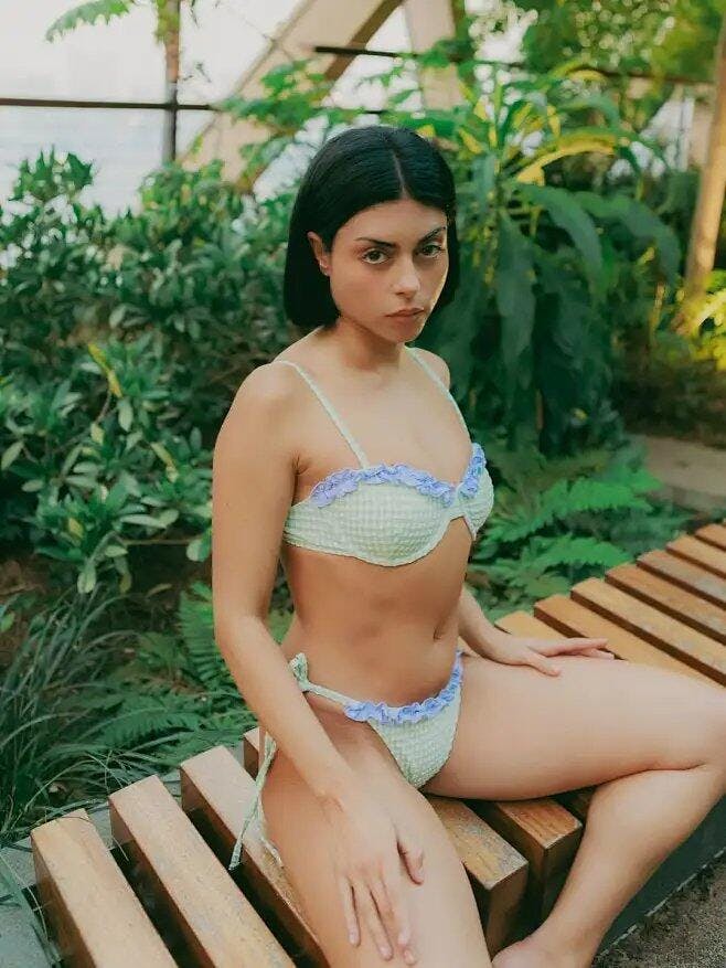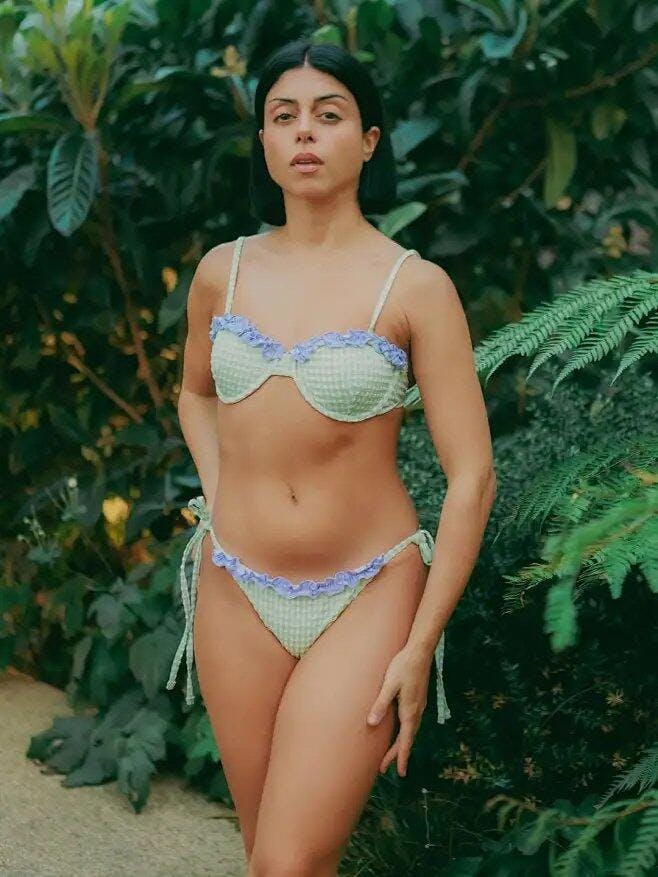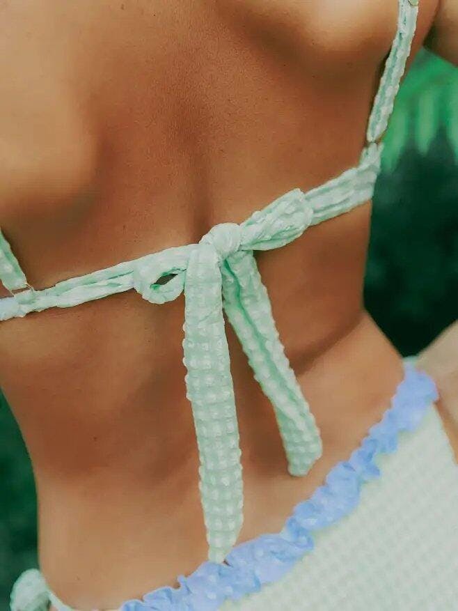 Dig this Green Nylon Blend Contrast Underwire Bikini! The 45% polyamide, 48% polyester, 7% spandex mix has a gentle stretch, with a soft 90% polyester/10% spandex lining. Demi underwire top with removable cups, square neck frames nicely. Strappy back adds flair, while plaid and polka dots mix playfully. High-cut legs flatter, moderate coverage feels just right. Ruffles, knots, textured jacquard and ties? Total charm. Retro yet fresh, comfy enough for all-day fun!
