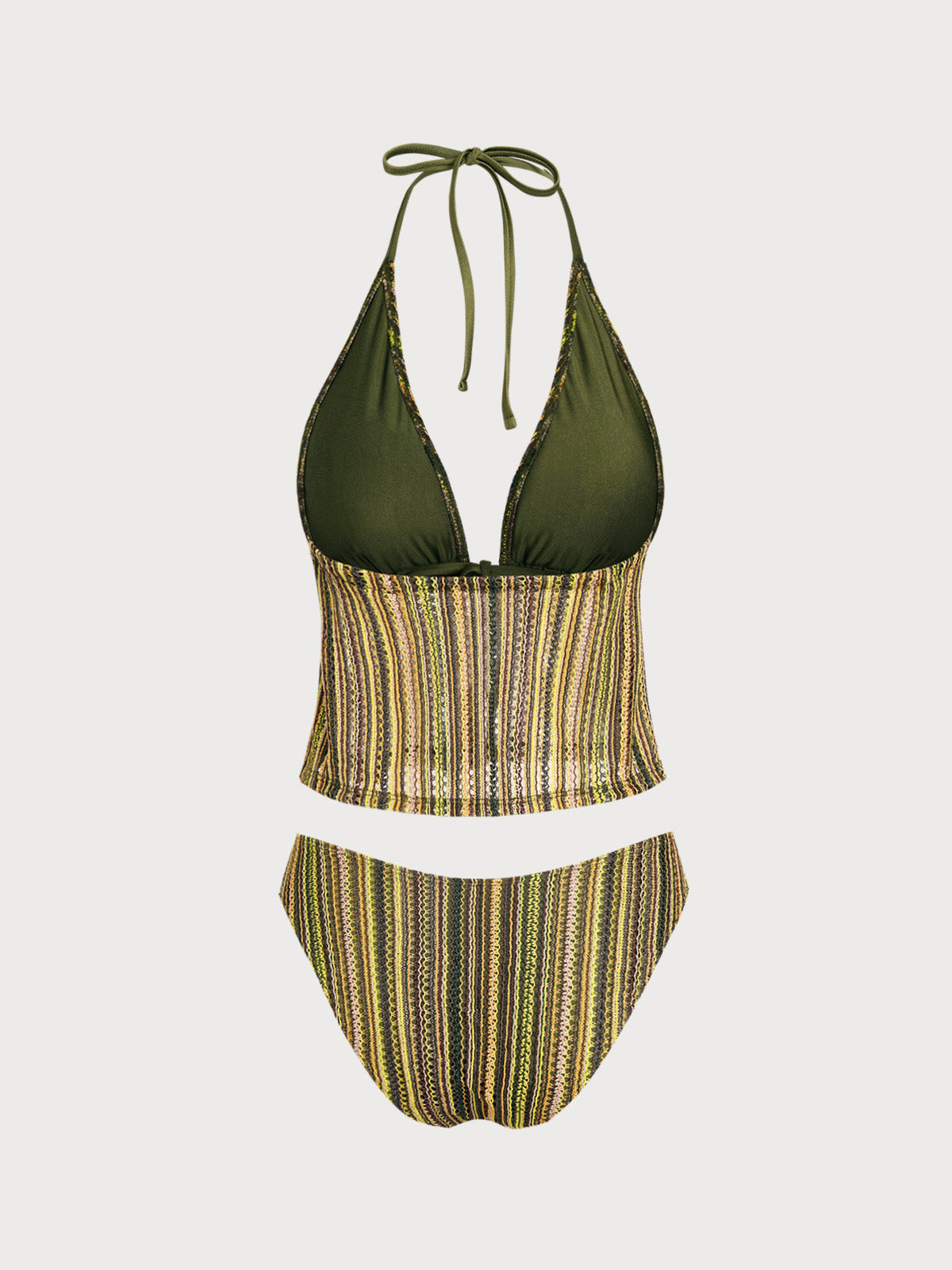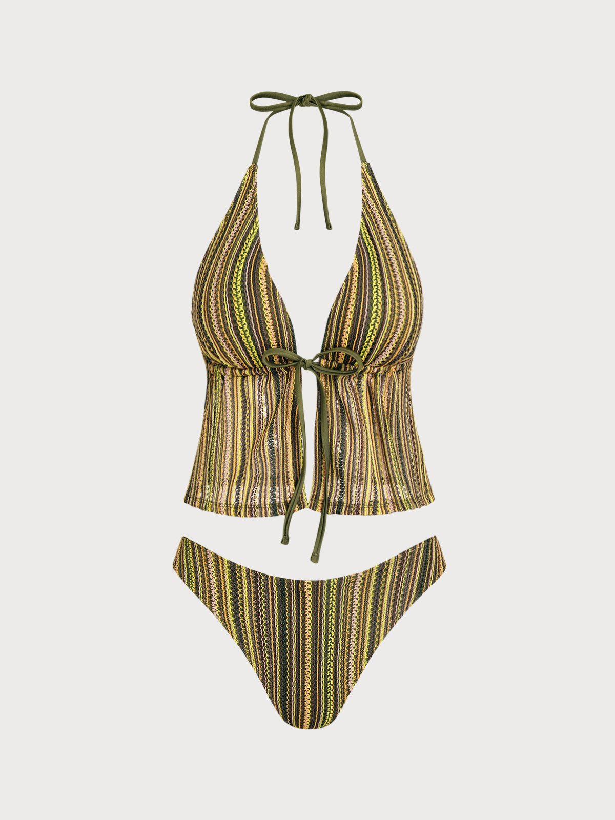 Command attention in our Green Polyester Knit Tie Front Tankini Set, where artisanal texture meets effortless allure. The tie-front top features a plunge neckline, secured by hand-tied knots, and provides 3/4 cup coverage with hidden removable padding. Precision-etched geometric stripes ripple through jacquard-knit fabric. Low-rise bottoms reveal high-cut legs for leg-lengthening drama. Lined in buttery-soft polyester-spandex (90/10), every contour stays supported.