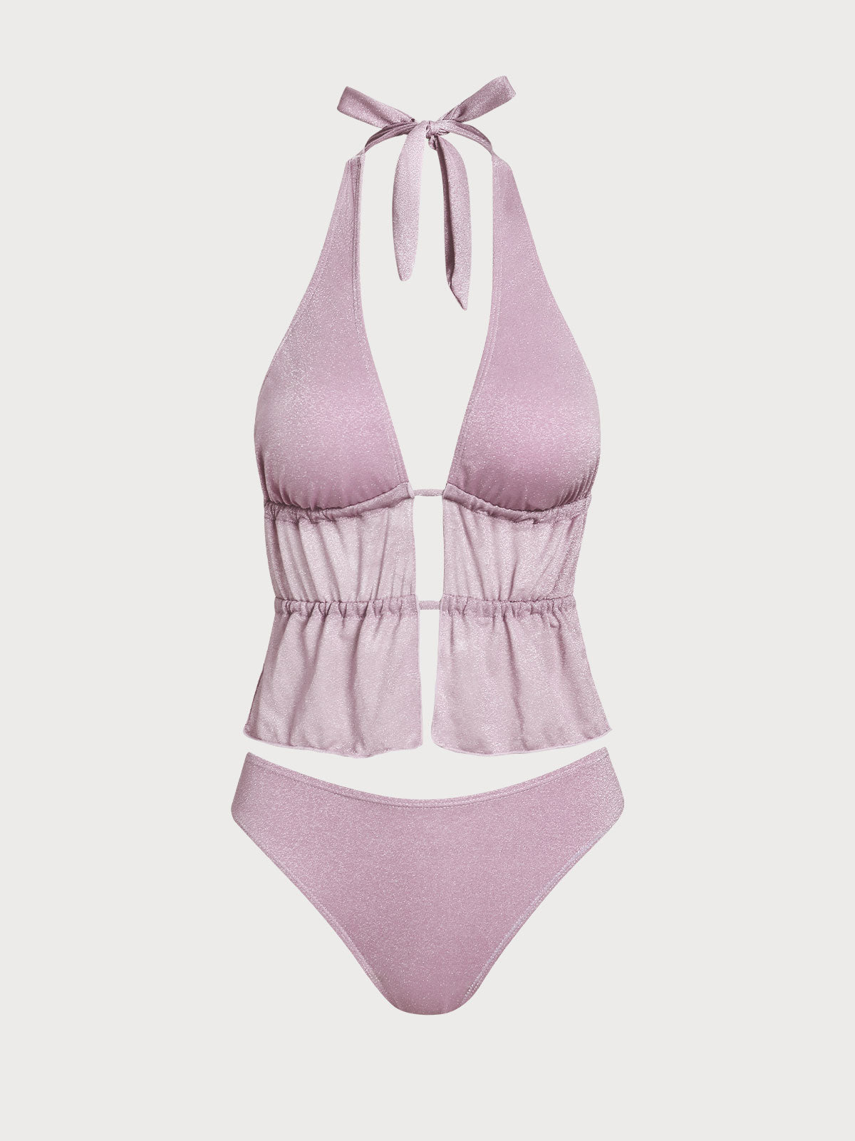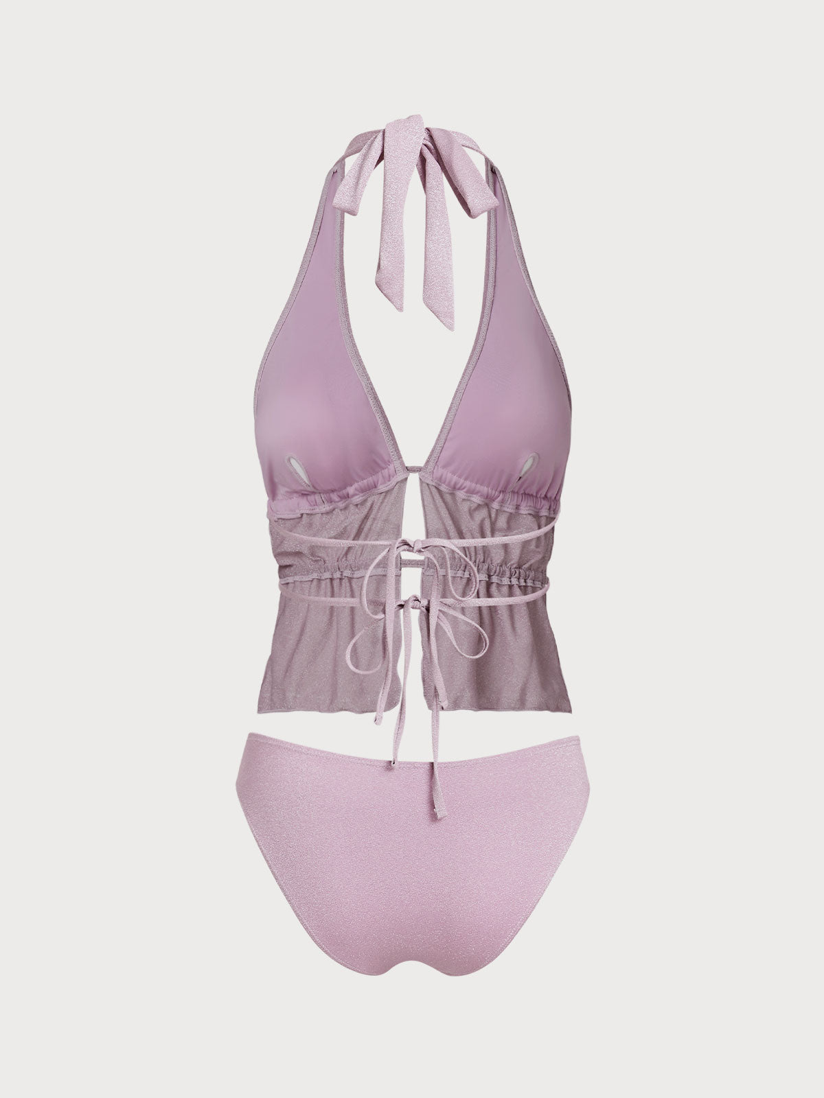 Pink Nylon Knit Glitter Tie Front Tankini Set