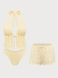 Brown Mesh Cover-up Tankini Three-Piece Set