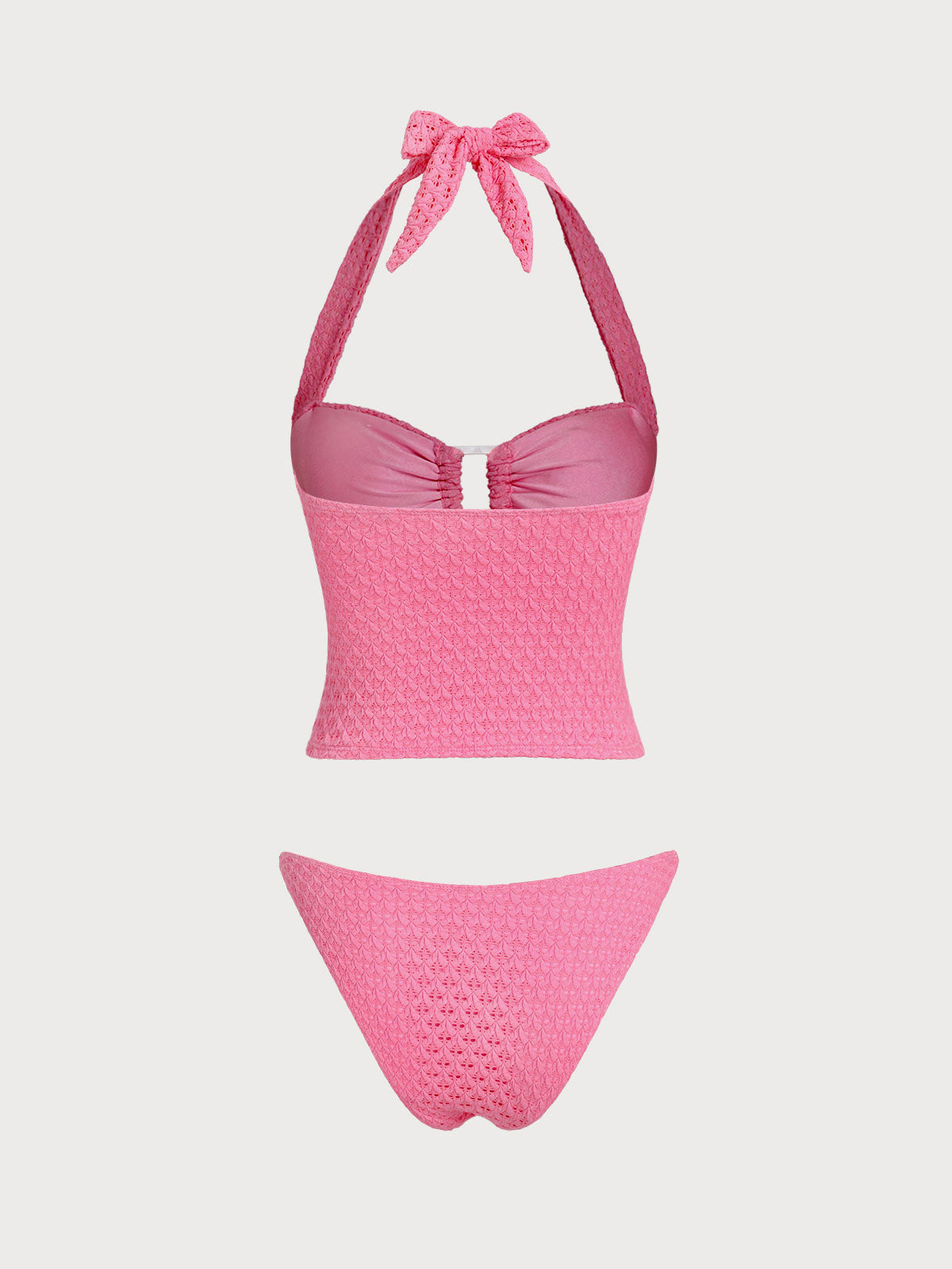 Discover the Pink Square Mesh Tankini—where geometry meets soft rebellion. Picture high-stretch fabric breathing against skin like a structured cloud. The halter neck suspends 3/4 cups with removable padding above ruched jacquard panels, while laser-precise square cutouts reveal glimpses of strappy latticework. Low-rise bottoms contour hips with mid-cut legs, anchored by hidden knot ties. This is vintage sci-fi reborn for salt-kissed afternoons.