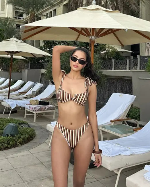 This bikini brings the perfect mix of cute and classy — the striped pattern adds a fun, youthful touch while the soft pink tones keep it feminine and fresh. The fit looks supportive yet flattering, ideal for relaxing by the shore or taking a dip. A dreamy beach-day essential that instantly elevates your summer vibe.