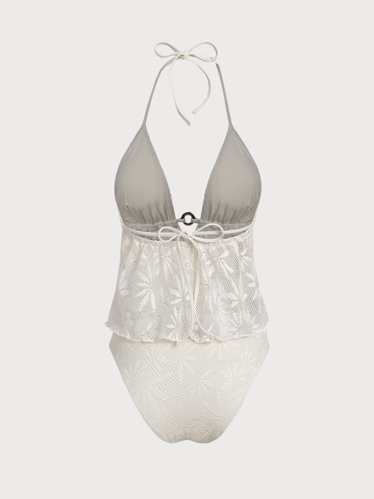 White Mesh Coconut Shell Ring Hollow Tankini Set