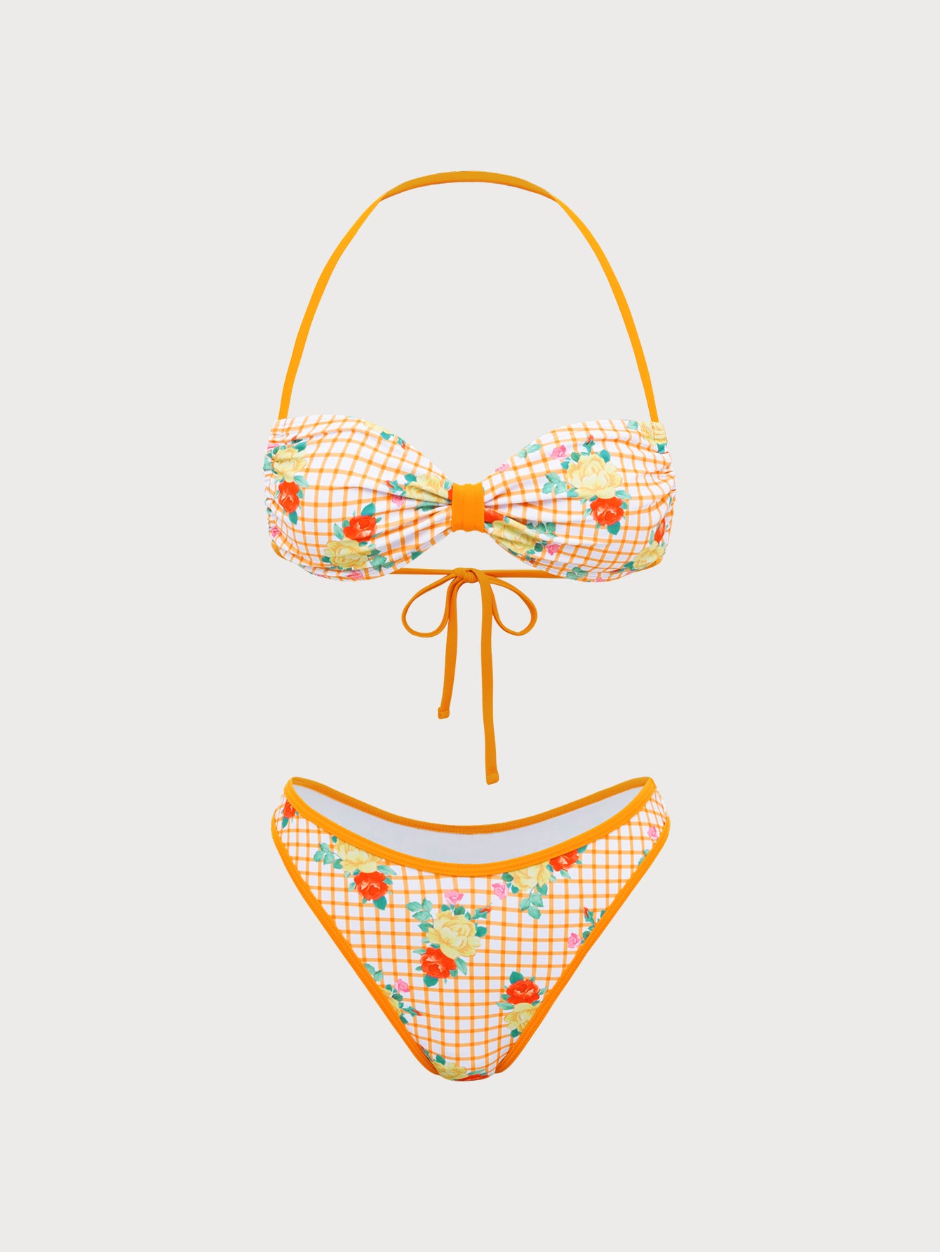 Our Yellow Floral Bikini Set features a strappy back and removable soft cups that provides a perfect fit for small to larger busts. This low rise bottom offers moderate coverage and matches great with that colorful floral plaid print to balance tails of skin tones.