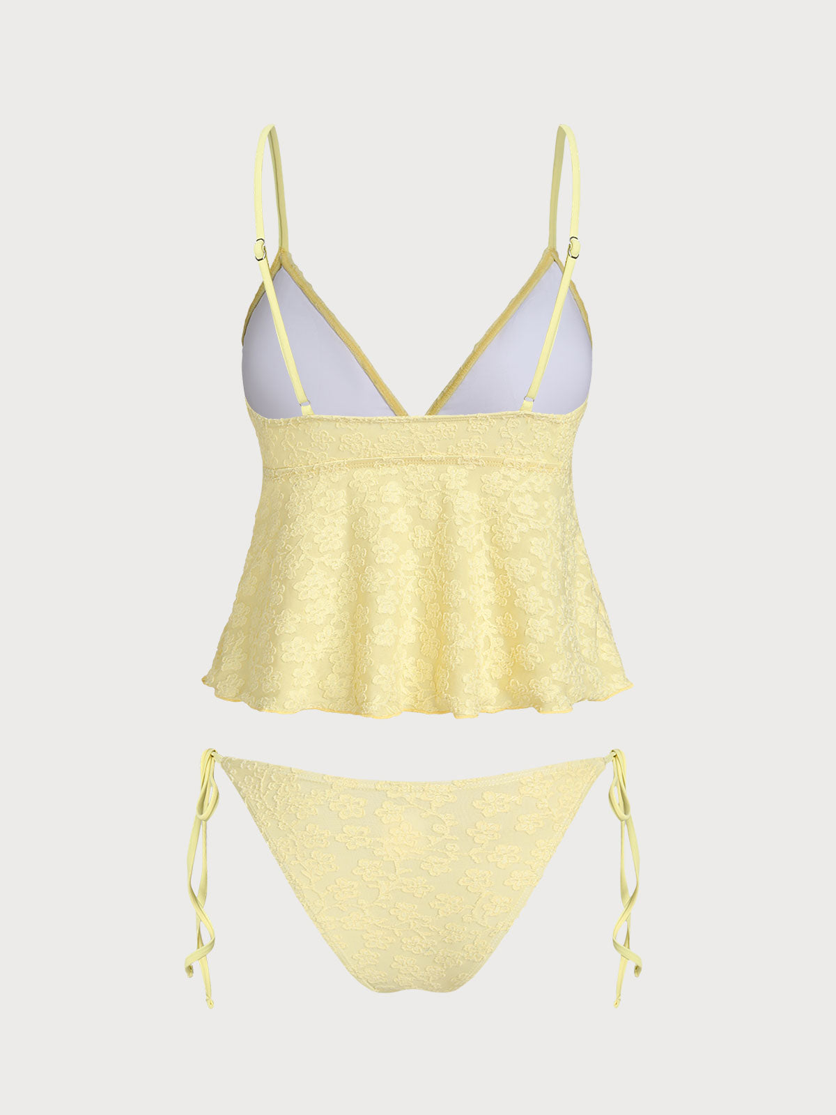 Yellow Polyester Knitted Jacquard Ruffle Tankini Set